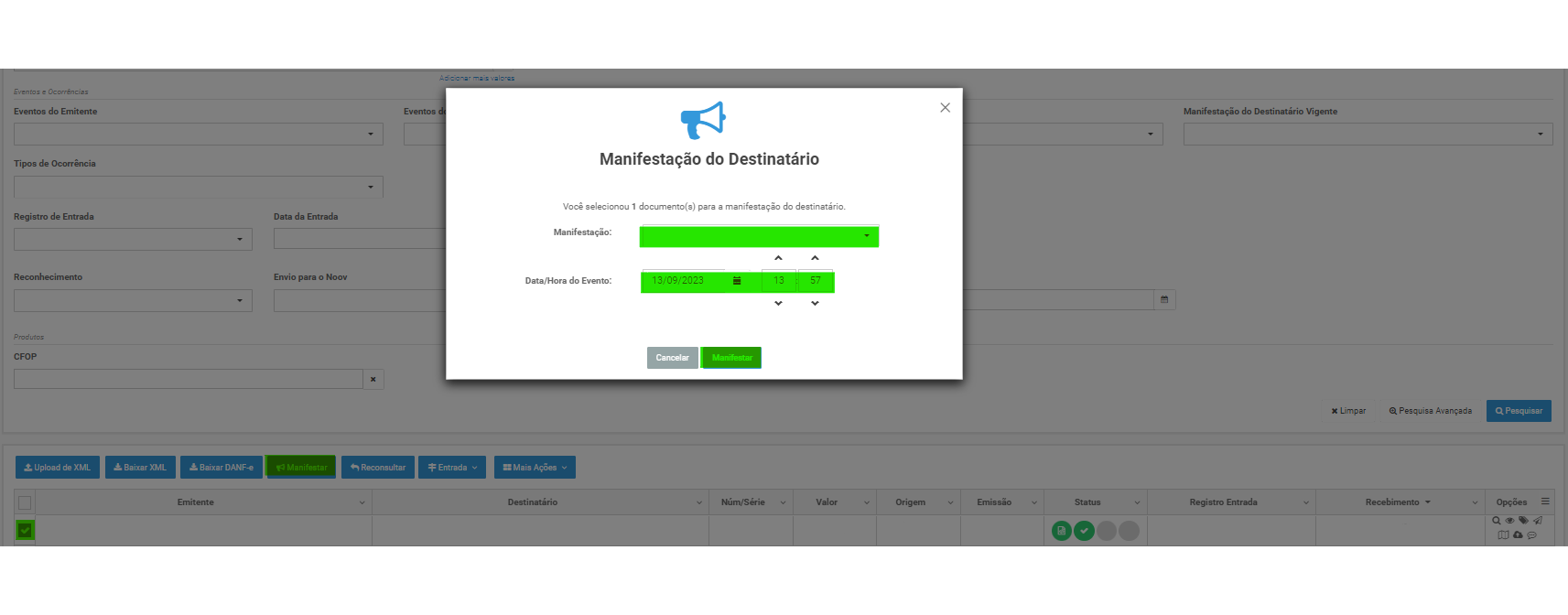 3- Após selecionar as opções desejadas e a data/hora do evento na pequena tela, é necessário pressionar o botão 'Manifestar'. Após a confirmação, as informações de eventos relacionadas a essas notas fiscais serão sincronizadas com nosso sistema em um período máximo de 30 minutos.